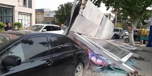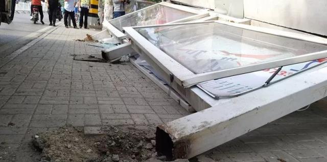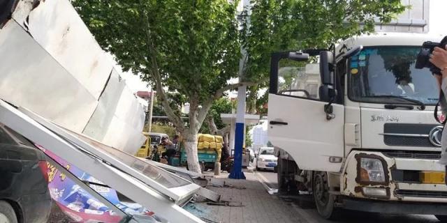 在現(xiàn)場看到,闖禍的洗掃車,停在東側(cè)的非機動車道上,而旁邊被撞的公交站臺已經(jīng)倒地,站臺棚損毀嚴(yán)重,站臺下面還砸著一輛黑色私家車。