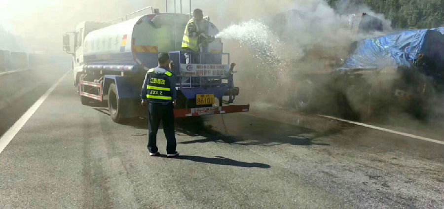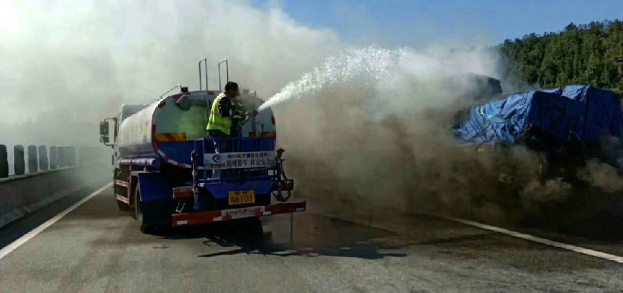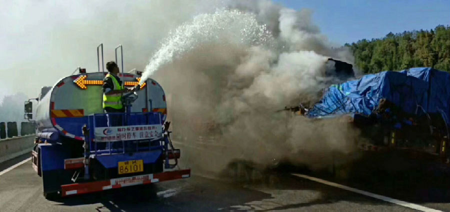 事情是這樣的,南昌的劉老板正在江西某告訴路上進行樹木養(yǎng)護灌溉,(大家肯會問南昌的劉老板咋跑江西告訴上養(yǎng)護樹木了,那是應(yīng)為南昌的劉老板進行招標(biāo),贏得了江西某告訴路段的養(yǎng)護)今天剛好在告訴路上進行樹木養(yǎng)護,看見前方路段冒起了濃煙滾滾的,根據(jù)劉老板多年的經(jīng)驗,一看就知道前方發(fā)生了火災(zāi),這位劉老板不管是森林火災(zāi)還是車輛火災(zāi),都要前去滅火,(大家都知道火在不管的情況下,才能變成火災(zāi),只要把火在剛開始燃燒的時候給滅掉就不會發(fā)生火災(zāi))這劉老板一過去就看見一輛半掛車在燃燒,這是的火還不是非常大,還是非常危險的,這劉老板不更具自己多年的經(jīng)驗判定火勢自己的灑水車能把火給滅了,上去就加大馬力,利用灑水車水炮進行滅火,經(jīng)過半小時火勢給控制住了,只剩濃煙,劉老板這不能松懈一定要等消防隊來啦交給消防隊才能放心,就在旁邊進行霧狀噴水,(大家都知道灑水車水炮是有兩種用途的,一種是水柱狀,這書水炮在水柱狀時是能消防滅火的,射程能達到35米,大家也要注意沖擊力大有危險,不要對準(zhǔn)人只用。二是霧狀,灑水車水炮霧狀時能降低空氣里面的粉塵,是分解濃霧的最得力的幫手。)