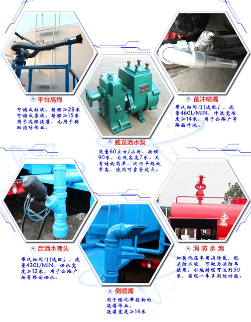 消防灑水車管道系統:由“管道、閥門、過濾裝置、出水口(前沖后灑、側噴;高位側花灑;后工作平臺,帶綠化灑水高炮)。
