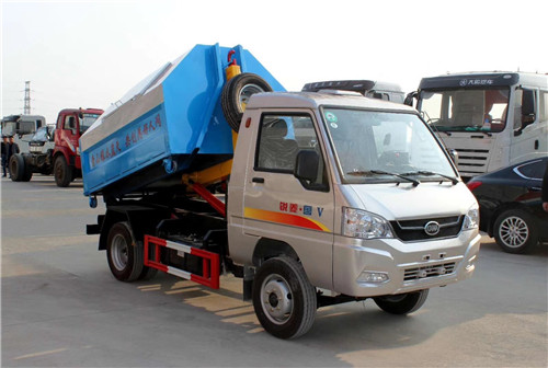車廂可卸式垃圾運輸車(又稱拉臂式垃圾運輸車)是由一輛備有液壓拉臂裝置的底盤和一只可卸式集裝箱組成。液壓拉臂機構(gòu)可以將放置在地面上的可卸式集裝箱從地面上拖拉到底盤上,或者從底盤上將集裝箱放到地面上。同時可以利用液壓拉臂機構(gòu)將集裝箱在底盤舉升,使集裝箱內(nèi)垃圾實現(xiàn)后傾式卸載。車和集裝箱可以像牽引拖掛列車式運輸車一樣分離。車將空集裝箱放下,再拉上滿載集裝箱即可運輸。液壓車廂可卸式機構(gòu)既可以作為集裝箱上車的拖拉機構(gòu),又可作為集裝箱內(nèi)垃圾后傾式卸載的卸載機構(gòu),一舉兩得。