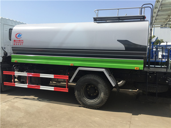 2、新款東風專底灑水車標配前沖、后灑、側噴、后工作平臺、綠化炮、自流閥、消防接口、水位計各1個,輸水管3米2根,罐體右后上方帶花灑2個。