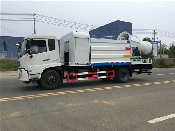 東風12噸抑塵車選配50米噴霧機達到除塵效果。霧炮機是根據風送原理,先使用進口高壓泵、微細霧化噴嘴將水霧化,再利用風機風量和風壓將霧化后的水霧送到較遠距離,使得水霧到達較遠距離同時能夠覆蓋更大面積,水霧與粉塵凝結后降落,從而達到降塵目的。