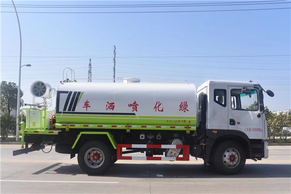1、高壓水炮――位于東風D9國六14.5方噴霧車后工作平臺上,可360度全方位旋轉,可連續(xù)調節(jié)成:柱狀、開花狀、大雨、中雨、毛毛雨、半霧狀等水流形態(tài),射程28米,可用于遠離沖洗建筑物、樹木、應急消防救火、重污染路面的定點清洗等。