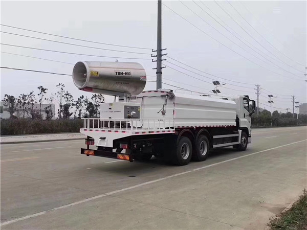 2.抑塵車功轉換效率高、射程遠、覆蓋面積大、霧粒細小且均勻、抑塵效果好。水霧與飄在空中的塵埃接觸時,被塵埃所吸附,加大塵埃的比重,抑制塵埃在空氣中的流動,并加速塵埃沉降,實現對空氣的凈化。