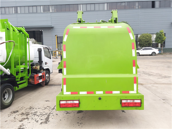 當(dāng)然,污水最終要從這一臨時空間中排除,不能在廂體前部積垢,則要求推板與廂體底板之間留有合適的間隙,通常為20mm左右,可以保證污水區(qū)的污水能夠緩慢流出。廂體設(shè)計通常使廂體底板與車架留有1°~3°的夾角,裝載垃圾時,夾角的存在可以使污水緩慢流向污水箱(前提是污水箱還有空間)。要讓污水能流人污水箱,通過結(jié)構(gòu)設(shè)計能夠滿足要求,與貼合面密封膠條不存在必然的關(guān)系。