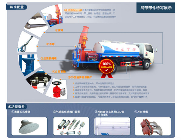加裝配置:藍牌抑塵車也可進行專業的罐體防腐防銹處理,加裝藥盤、非車帶泵動力、做噴藥車使用,需要專業噴藥車用戶請告知我公司,安裝高壓噴藥設備、專業霧化處理系統。使前沖、后灑、側噴功能獨立控制,駕駛員可在車內操作。也可加裝液位計。可配置全功率消防灑水泵,應急時可作消防灑水車之用。