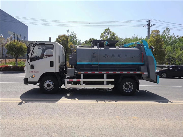因此,有的餐廚垃圾車(chē)設(shè)計(jì)考慮在廂體前端車(chē)架兩側(cè)設(shè)有副污水箱。但這樣布置較困難(影響到電瓶、油箱的使用),不易清污,不便排水,沒(méi)有實(shí)際使用價(jià)值。 另外廂體前板觀察窗不需要開(kāi)得太大,窗口設(shè)計(jì)可考慮使用活動(dòng)檔污板。污水累積區(qū)雖然可以成為臨時(shí)的污水箱,但在車(chē)輛顛簸時(shí)常會(huì)因?yàn)榇翱诖蠖刮鬯绯鰩w,濺落在駕駛室后窗上,并使駕駛室與廂體之間布置的控制件如閥、PLC的使用受到影響。