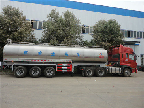 2、鮮奶運(yùn)輸車罐體容積45立方,分5倉(cāng),罐體外部需作保溫層防止鮮奶變質(zhì),罐體內(nèi)部用特種設(shè)備拋光,可充分保證鮮奶不掛壁,內(nèi)部要求光潔、無(wú)銳角,在每個(gè)奶艙內(nèi)加上cip(清洗裝置)。 鮮奶運(yùn)輸車罐體整體分三層,罐體內(nèi)膽,材質(zhì)為304/2B食品級(jí)不銹鋼,板厚度5mm,中間部分為聚氨酯發(fā)泡保溫層,厚度為80mm,人孔部分聚氨酯發(fā)泡為60mm厚。保溫效果在24小時(shí)±1℃。罐體最外部為1mm厚304不銹鋼鏡面板,。 內(nèi)膽部分有清洗裝置,清洗桿(或清洗球);清洗管(Φ38mm),旋轉(zhuǎn)清洗噴頭. 外部接上水源即可自動(dòng)清洗罐體,造 型美觀,結(jié)構(gòu)科學(xué),自重輕,強(qiáng)度好,罐口采用特制雙層保溫不銹鋼罐口5個(gè),5個(gè)2.5寸不銹鋼自流口卸料.