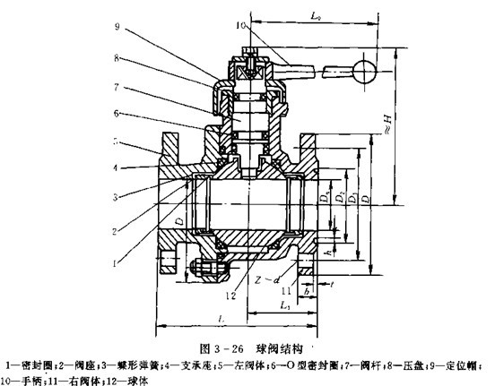放油閥常用的有球閥、蝶閥等。目前各類加油車大多用鋁合金球閥,通徑¢25mm的球閥保留了原閘板閥的外部連接尺寸,通徑¢50mm、¢65mm、¢80mm、¢100mm四種規(guī)格的球閥主要尺寸列于表3-2,結(jié)構(gòu)如圖3-26所示。這樣,與管道的連接法蘭尺寸都可實現(xiàn)標(biāo)準(zhǔn)化,軟管接頭和接頭閥亦采用國際通用的通徑¢63.5mm(¢2.5in).