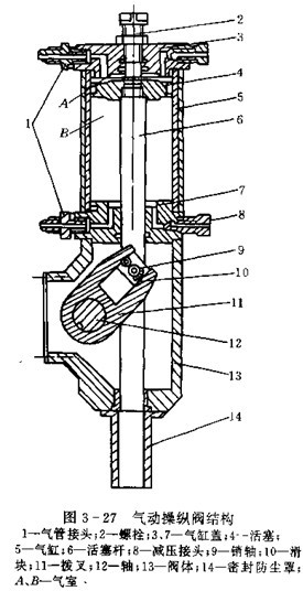 放油閥的操縱形式有手動,液動,氣動和電動等,根據(jù)總布置要求確定,手動形式簡單,在無特殊要求時,一般采用手動,為提高機(jī)械化程度,也可采用液動或氣動,液動力源可取本車動力轉(zhuǎn)向系統(tǒng)的壓力油液,氣壓源可取本車制去氣源。電動形式容易引起火災(zāi)。圖3-27為氣動操縱閥的結(jié)構(gòu),用來操縱放油閥或其它的控制閥,當(dāng)氣室A充氣,氣室B排氣時,空氣壓力推動活塞4通過活塞桿6滑塊10使拔叉11轉(zhuǎn)動,于是轉(zhuǎn)軸12使放油閥(控制閥)開啟或關(guān)閉。