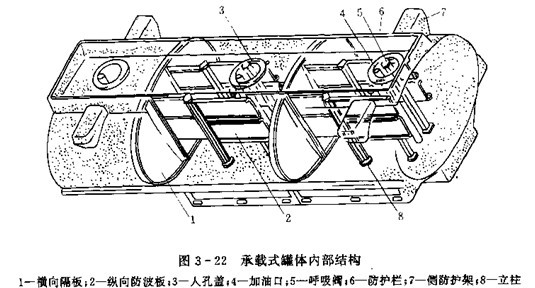 加油車的罐體與運(yùn)油車的罐體相似,也具有運(yùn)油車罐體的基本裝置。圖3-22為大型加油車罐體結(jié)構(gòu)示意圖。橫向隔板1將罐體分成三個艙,每個艙內(nèi)設(shè)有橫向防波板。罐體寬度較大時,可再設(shè)縱向防波板。2防護(hù)欄6和側(cè)防護(hù)架7是用來保護(hù)加油口,呼吸閥等不受意外碰傷,以免造成燃油外溢。大型罐體還可采用立柱8以提高罐體剛度。