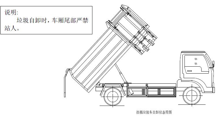 將提升操作手柄推至收回位置,箱體右側(cè)提升機(jī)油缸或頂端上蓋開蓋油缸收回,使提升機(jī)帶動(dòng)垃圾桶向下回落并放置于地面,松開操作手柄使其回到中位,完成一次載,然后松開取力器,該車可以運(yùn)輸行駛。另注意:箱體內(nèi)若加裝小刮板,請按操作指示牌的方向推動(dòng)手柄,使刮板推出,將箱體前端的垃圾推刮到箱體后部,并且在再次裝載垃圾前將手柄反向拉回,使刮板收回,手柄回中位;以防止垃圾倒入刮板和箱體前端而被卡?。蝗粝潴w內(nèi)沒有加裝小刮板,為防止垃圾僅僅裝在箱體前端,這時(shí)可將自卸操作手柄推至開啟位置,箱體底部自卸油缸伸出,使箱體繞自卸翻轉(zhuǎn)座旋轉(zhuǎn)舉起一定角度,使箱體前端的垃圾因自重而滑到箱體后部,完成后將操作手柄反向拉回或回中位,箱體下落放平松開手柄。