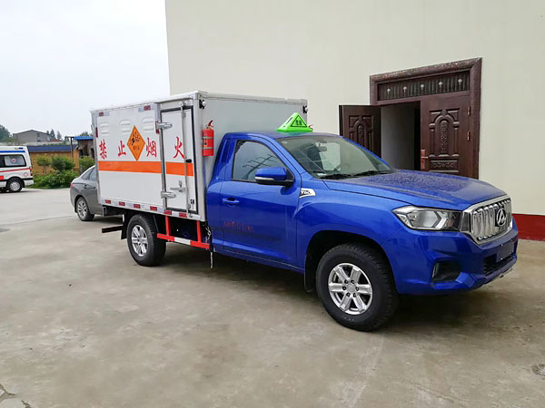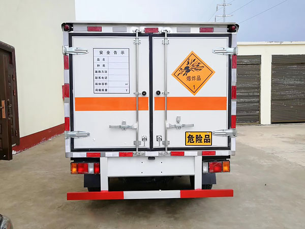 廂體全金屬整體骨架結(jié)構(gòu),外飾冷軋鋼板(隔熱,防靜電),內(nèi)飾鋁板(隔熱,防靜電),中間骨架結(jié)構(gòu)(提高廂體強度),所有箱板內(nèi)部填筑阻燃高強度泡沫板整體高壓粘合鉚接后焊接拼裝成廂型,底板鐵板上鋪設(shè)防靜電膠皮(絕緣,導(dǎo)靜電),前臉底部鋁板上加裝靜電防撞膠皮,內(nèi)飾臥環(huán)(固定貨物定位拉環(huán)),透氣孔,外部帶通風(fēng)孔,保持廂體與外部空氣流通,及時與外部空氣交換,確保安全,大梁加裝拖地靜電膠帶,把貨物摩擦靜電導(dǎo)入大地。車輛門框配備防盜報警器,廂內(nèi)頂部安裝煙霧報警器,前廂板左右立柱安放滅火器,排氣管前置安裝排氣火花熄滅器,駕駛室安裝“危險品”標志燈,車廂外中部粘貼橙色反光帶一周,并在車廂左、右、后安裝“爆炸品”菱形牌3塊,車體后部設(shè)置安全告示牌、“危險品”黃色警示牌,后保險杠安裝緩沖加強橡膠塊等。車廂開側(cè)門,方便裝卸貨物;可加開隔倉,方便不同性質(zhì)的爆破物品同車分倉運輸。