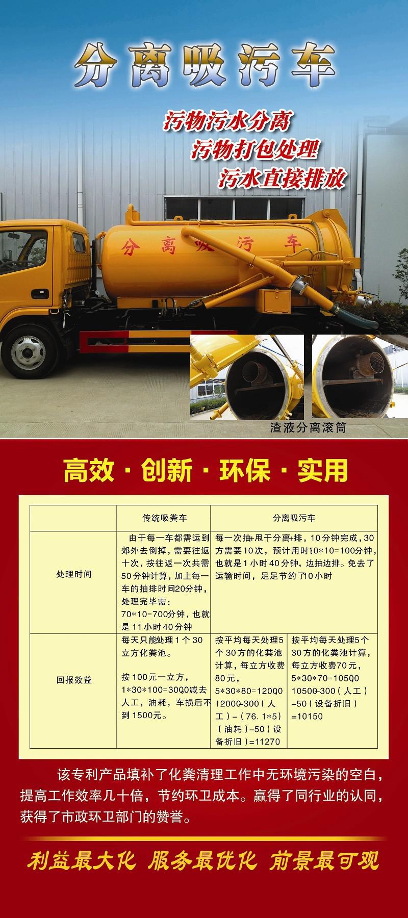 分離式吸污車采用國內技術領先的吸污專用泵,吸力大,吸程遠,特別適合用于下水道內的淤積物的抽吸、裝運和排卸,尤 其是可吸下水道泥漿、淤泥、石子、磚塊等較大物體、含水量較小等物質。抽滿污(糞)罐體時間:≤5min,吸程:≥10m。自吸自排,壽命長,工作速度快 ,運輸方便。