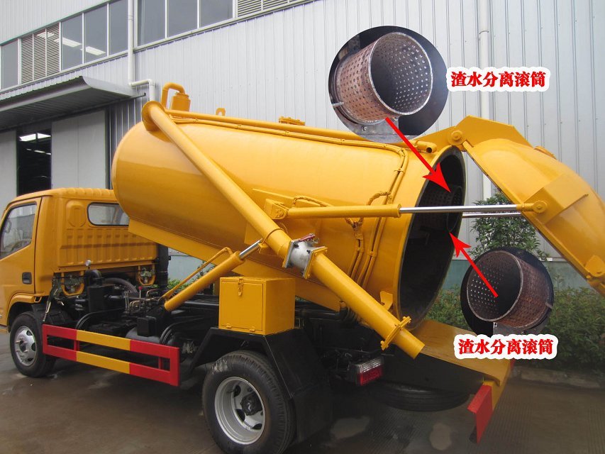 分離式吸污車罐體可采用:碳鋼、不銹鋼。 吸污車專用部分由取力器、傳動軸、專用真空吸污泵、高壓成型糞罐、水氣分離器、油氣分離、多路換向閥、 吊桿、吸污槍,管網系統組成,并裝有真空壓力表、視污窗(管),洗手裝置。